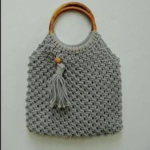 Grey Handmade Macrame Bag with Wooden Handle